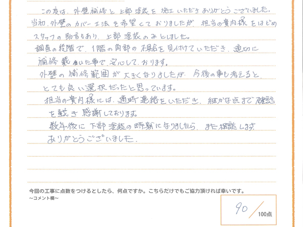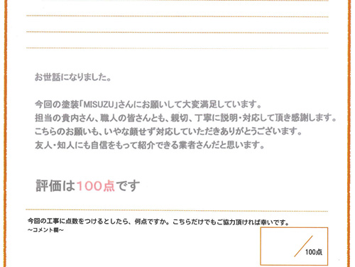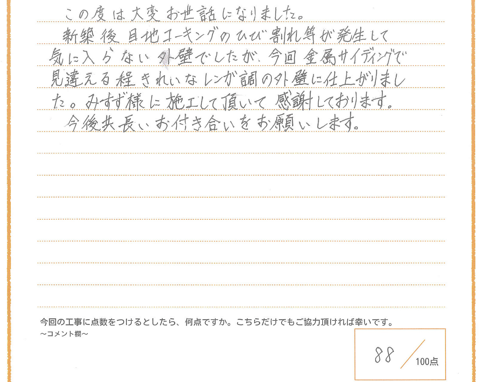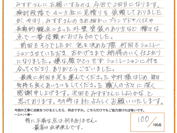 みすずさんのきめ細かいプランアドバイスや 長期的観点に立った外壁塗装のあり方など、種々な 点で一番信頼がおけるものでした。