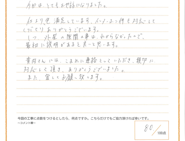 調査の段階で1階の角部の不具合を見付けていただき、適切に補修戴いた事で安心しております。