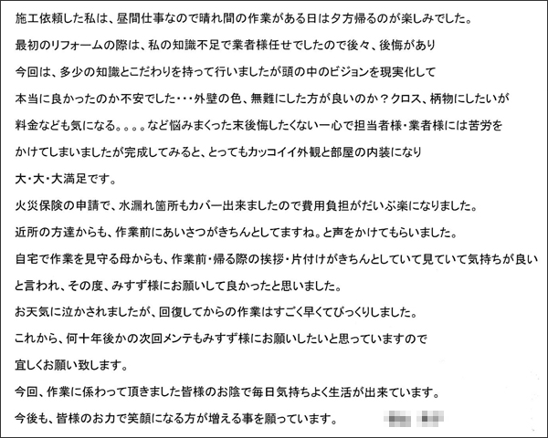 今回のリフォームで3件見積りをお願いしましたが、 みすずさんの説明と金額に納得して決めさせて頂きました。