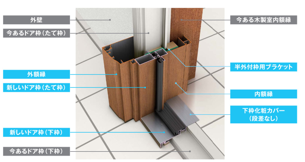 | 玄関ドアは今あるドアの枠に新しい枠をかぶせるカバー工法。 1日で新しいドアに生まれ変わります。 |